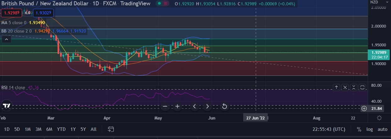 • Strong support is seen at 1.9282 (38.2%fib) and break below could take the pair towards 1.9182 (Lower BB).