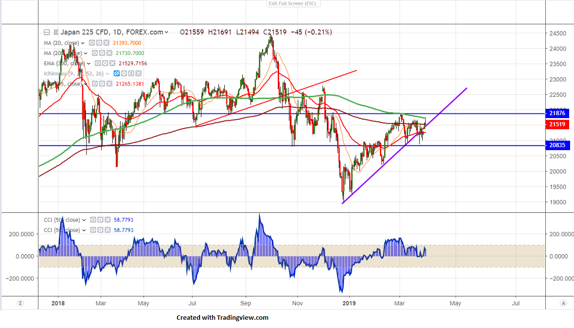 Asian markets are trading higher especially Shanghai jumped more than 2% on easing trade tensions between US and China.Chinese PMI data came in at 50.8 in Mar compared to forecast of 49.90.Shanghai composite has broken major resistance at 3129.90 high made on Mar 7th 2019 and jumped till 3161. US 10 year yield shown a minor recovery of more than 4.5% after hitting fresh 14-month low yesterday at 2.34%. USDJPY is trading higher after minor correction.It has jumped more than 100 pips from low of 110.02 and is currently trading around 111.08. US markets has closed slightly higher with Dow Jones at 25928 (0.82% higher) and S&P500 2834 (0.67% higher). Nikkei has lost nearly 200 points from high of 21691 and is currently trading around 21514.
