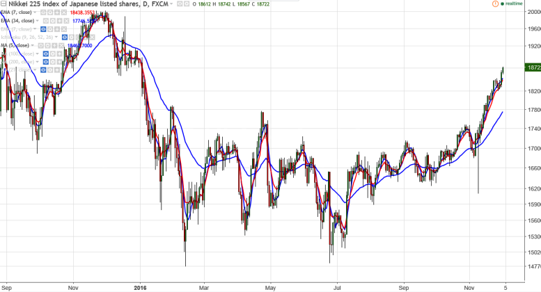 Nikkei225 hits year high and is trading well above 18482 recent high made on account of OPEC production cut deal. It is currently trading at 18727 0.63% higher.