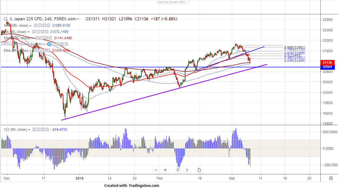 Asian markets are trading lower following foot steps of US market.The ECB has kept its rates unchanged as expected and announced some dovish policy measures. It has trimmed growth forecast from 1.7% for 2019 to 1.1%. The central bank said it would introduce a new set of stimulus measure TLTROs new round of cheap loans. US markets has closed lower for third consecutive day with Dow Jones at 25473 (0.78% lower) and S&P500 2748 (0.81% lower).Nikkei has formed a top around 21873 and declined nearly 800 points.It hits intraday low of 21096. USDJPY lost more than 50 pips from high of 112.13 level.It is currently trading around 111.44.