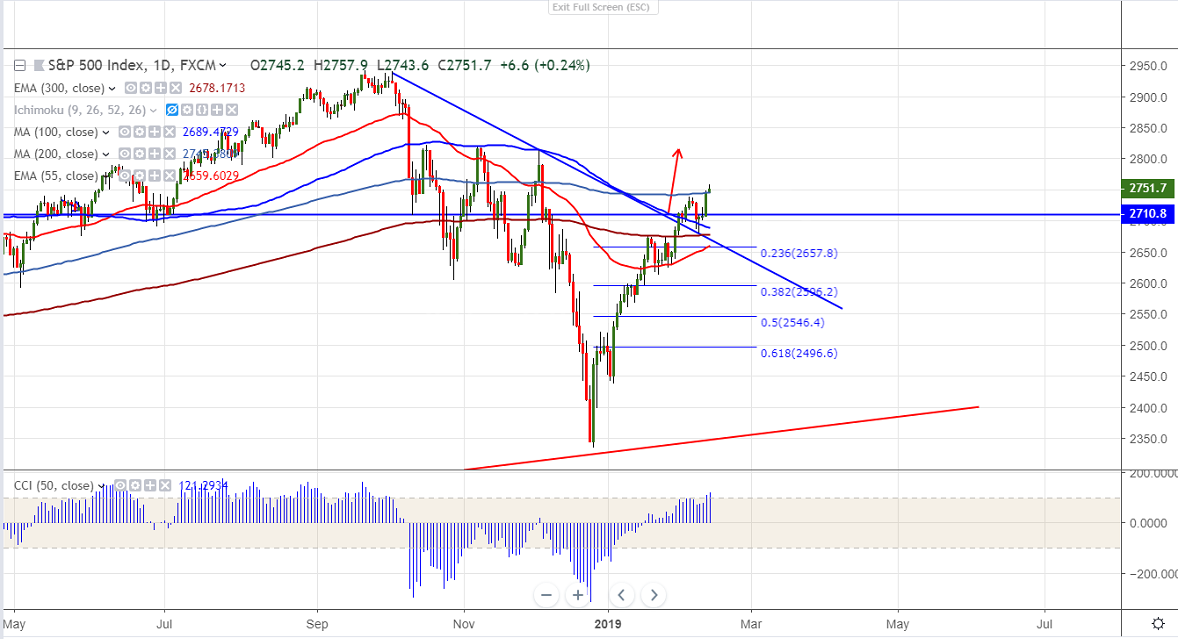 S&P500 is trading higher and broken major resistance 2744 (200- day MA) after a long consolidation. The index has closed around 2744 highest level since Dec 3rd. The jump was due to better than expected corporate earnings and easing US-China trade tension.