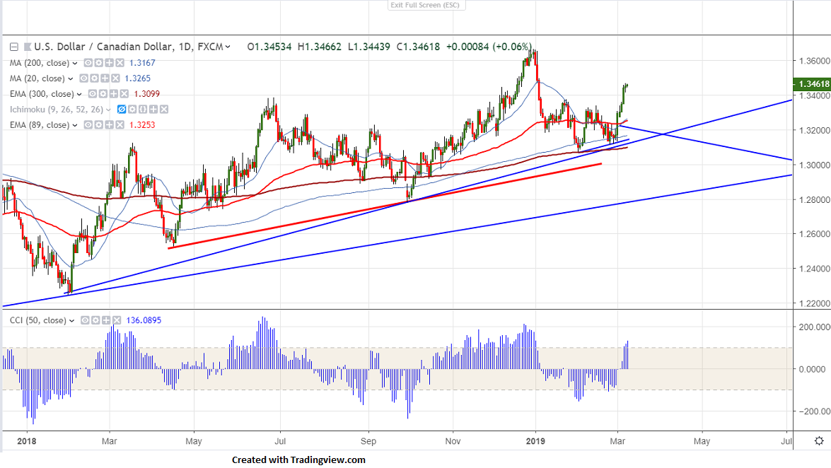 USD/CAD is trading higher for 6th consecutive day and jumped more than 300 pips from the low of 1.31299 level.The jump was mainly due to dovish BOC monetary policy.Bank of Canada kept its interest rates unchanged at 1.75% and said that Canadian economy will be much weaker in firs half of 2019.Markets eye US/Canadian Non farm payroll for further direction.The pair hits high of 1.34675 and is currently trading around 1.34608.