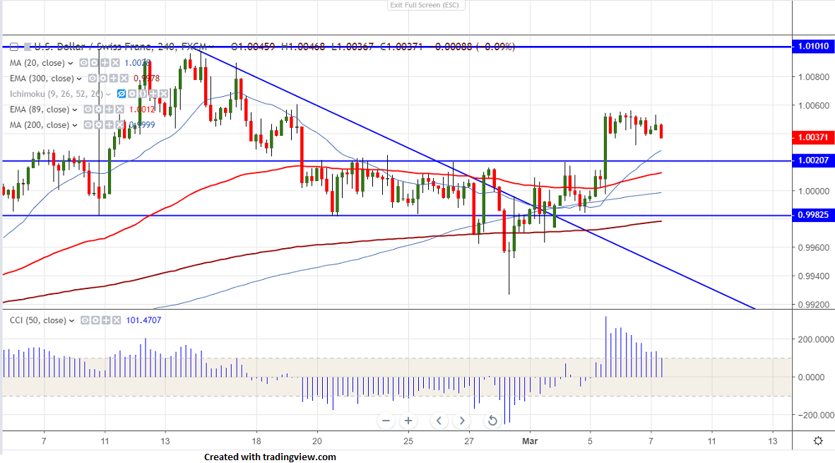 USDCHF is consolidating after a continuous five days of bullish trend.It hits high of 1.00562 and shown a minor decline. The pair has recovered nearly 130pips from low of 0.99264 on hopes of US-China trade deal and broad based US dollar buying. But Brexit uncertainty is major factor which prevents Swiss franc from further weakness. It hits low of 1.00316 and is currently trading around 1.00376.