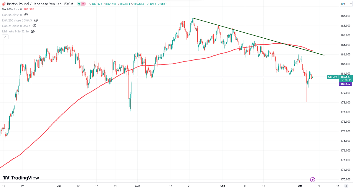 GBPJPY showed a minor pullback after a massive sell-off. It hit a low of 178.03 and is currently trading at around 180.67.