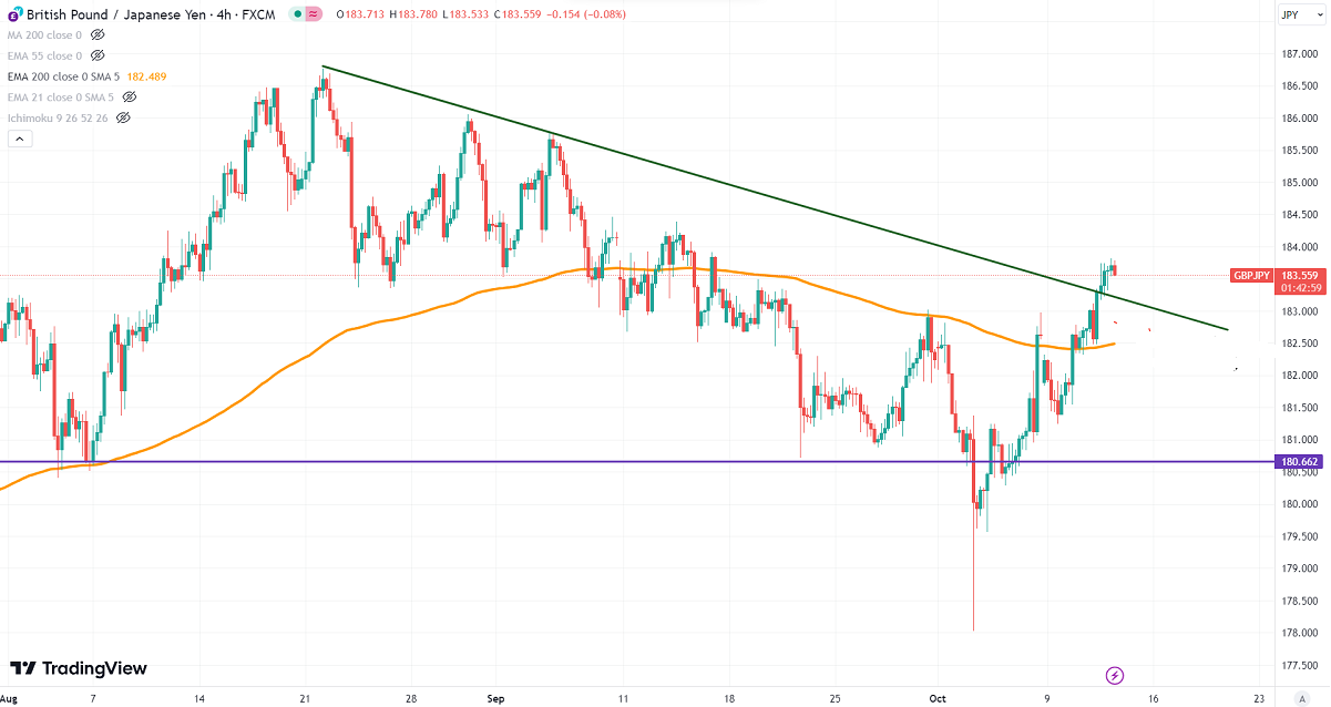 GBPJPY is consolidating after a nice pullback on the strong Pound sterling. It hit a high of 183.814 and is currently trading at around 183.61.