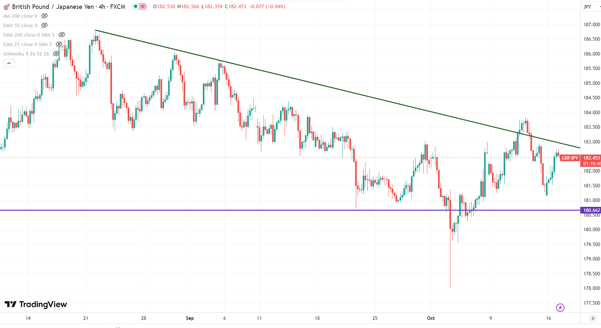 GBPJPY showed a minor pullback on the strong Pound sterling. It hit a high of 182.73 and is currently trading at around 182..45.