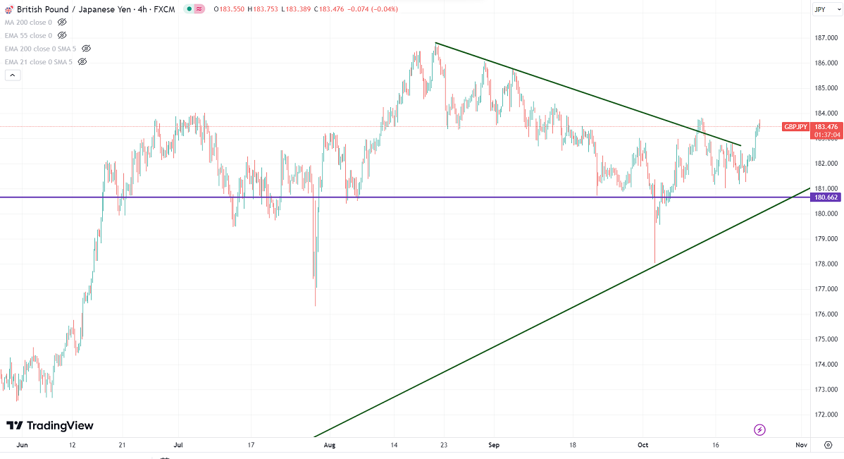 GBPJPY showed a nice pullback on the strong Pound sterling. It hit a high of 183.75 at the time of writing and is currently trading at around 183.30.