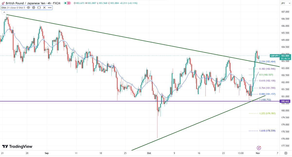 GBPJPY hits a six-week high on a weak yen. It hit a high of 184.29 yesterday and is currently trading at around 183.744.