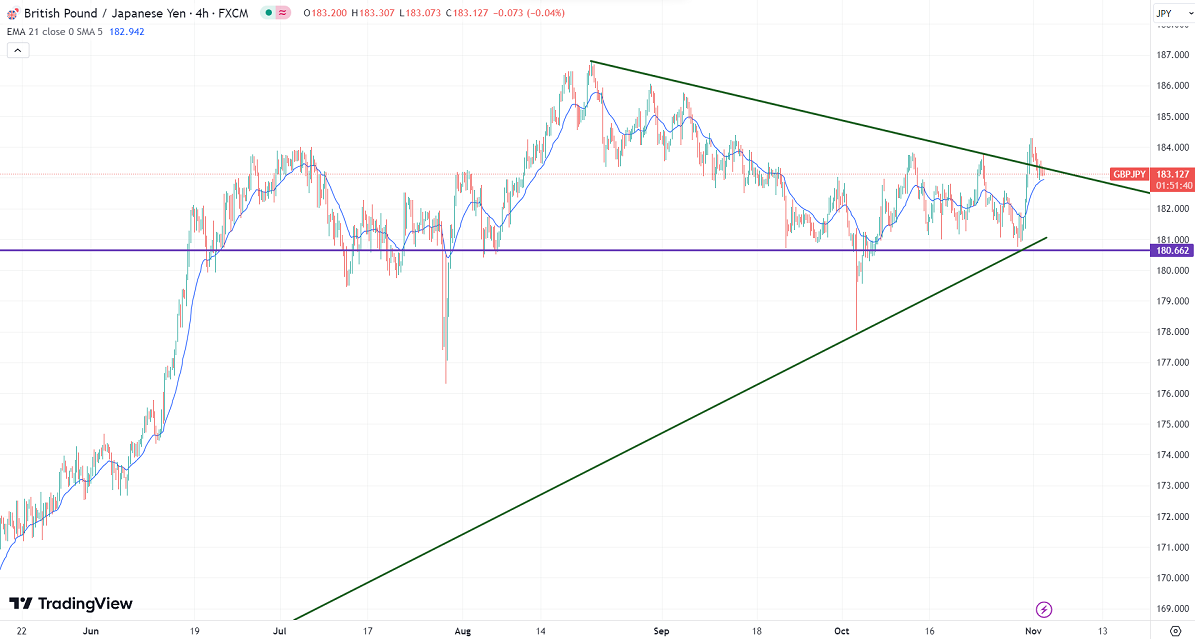 GBPJPY pared some of its gains ahead of Super Thursday. It hit a low of 183.09 at the time of writing and is currently trading at around 183.13.