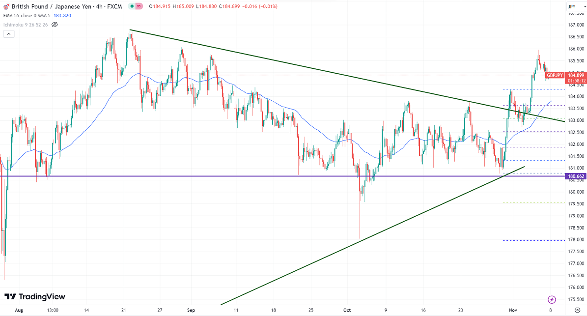 GBPJPY pared some of its gains on the weak Pound sterling. It hit a high of 185.95 and is currently trading at around 184.91.