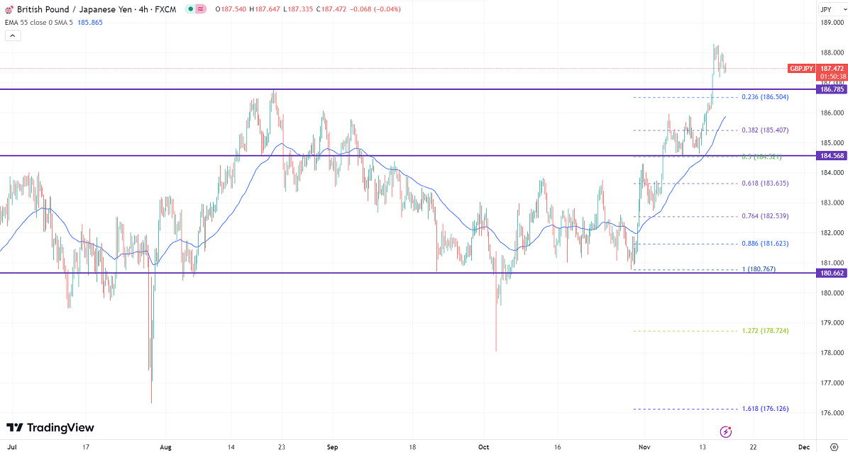The near-term resistance is around 188.35, a breach above targets 189.20/190. The immediate support is at 186.50, any violation below will drag the pair to 185.80/183.60/.