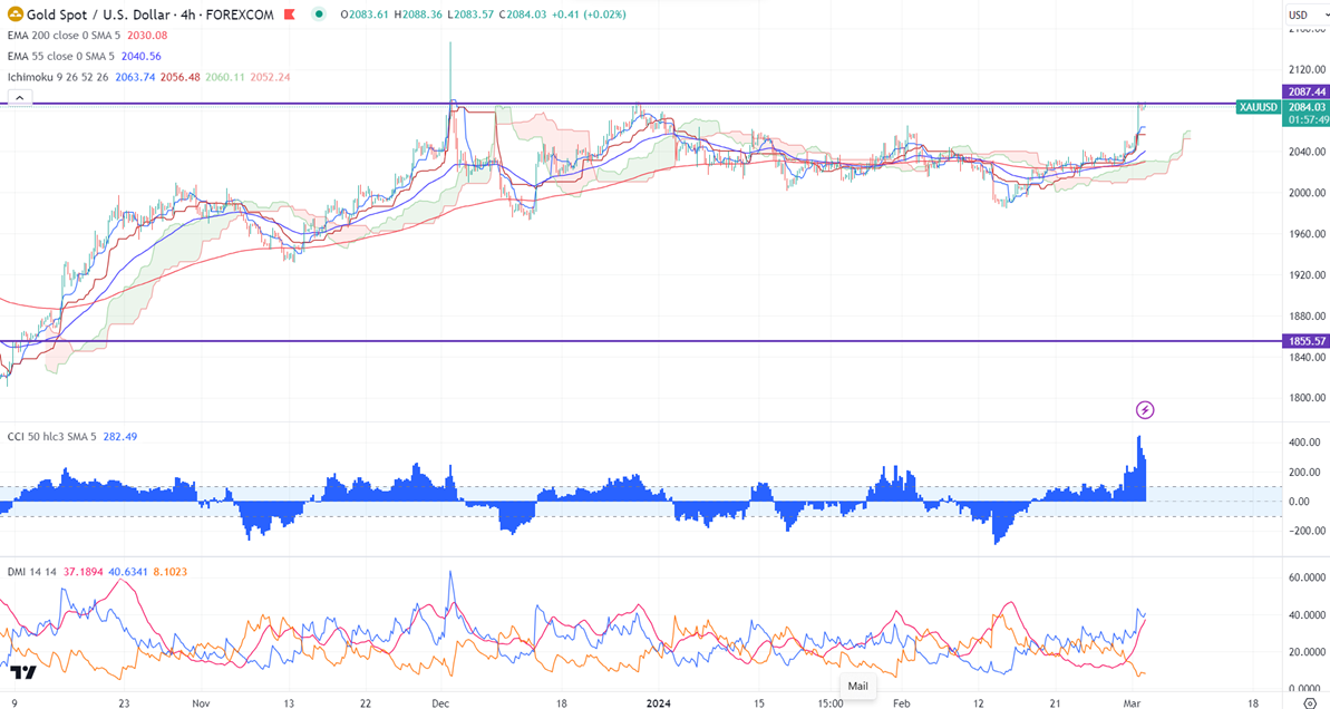 Gold showed a massive jump of $40 after a weak US ISM manufacturing index. US ISM manufacturing PMI declined to 47.8 in Feb compared to a forecast of 49.50. Both core and headline PCE came in below expectations. The yellow metal hit a high of $2088 yesterday and is currently trading around $20.