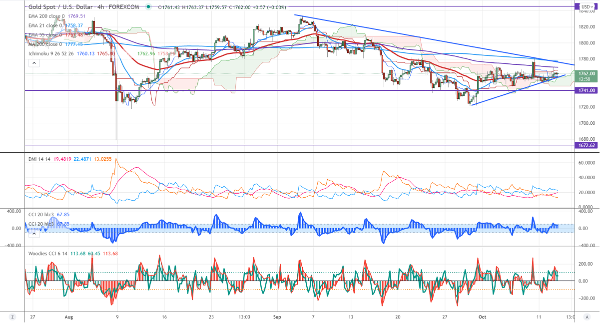 Gold is trading flat ahead of US CPI data. The yellow metal hits a high of $1781 after dismal US jobs data. The yellow metal pared its gains on strong US dollar and surging US Treasury yields. The US dollar index is trading in a narrow range between 94.44 and 93.67 for the past week. Any surge past 94.50 confirms further bullishness. Gold hits an intraday high of $1762.10 and is currently trading around $1762.37.