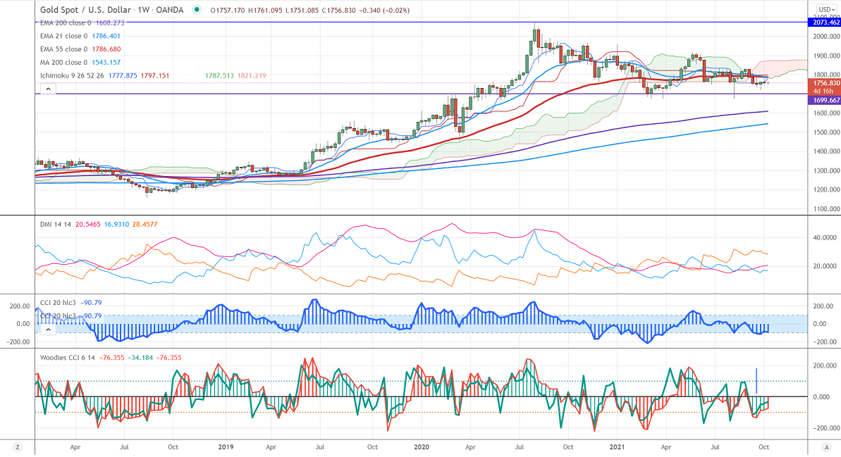 Gold pared most of its gains made after US jobs data. The US economy has added 194000 jobs in Sep vs forecast of 490K. While the unemployment rate declined to 4.8% from a forecast of 5.1%. The US dollar index is trading in a narrow range between 94.44 and 93.67 for the past week. Any surge past 94.50 confirms further bullishness. The number of people who have filed for jobless benefits declined last week by 38000 to 326000 compared to a forecast of 350000. Gold hits an intraday high of $1761.05 and is currently trading around $1756.32.