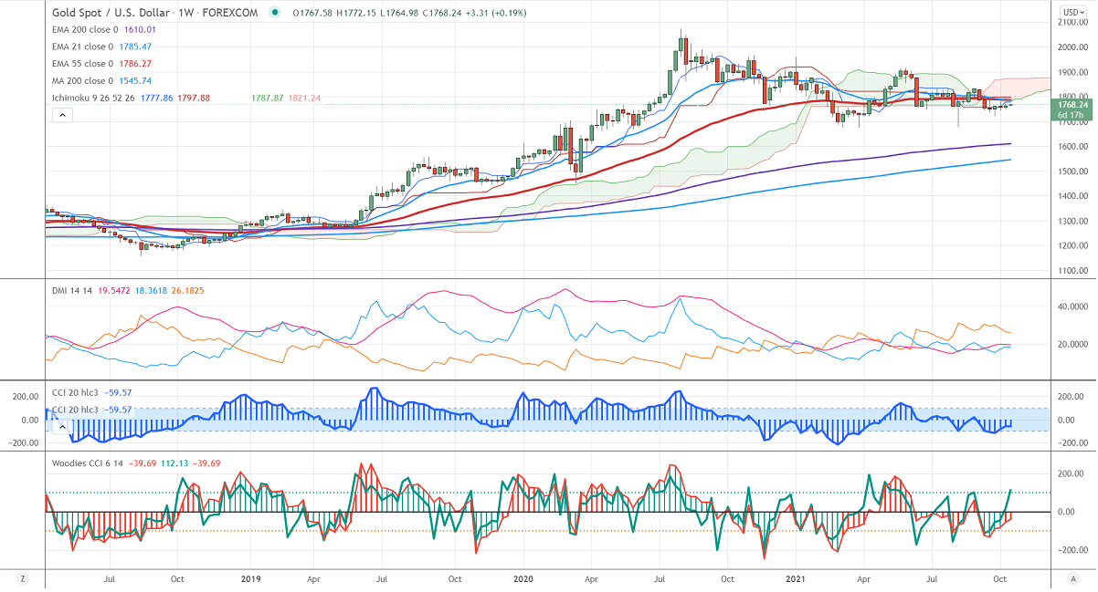 Gold pared some of its gains made on Friday and lost more than $30 on upbeat market sentiment. The yellow metal surged despite positive US inflation data. The US dollar index has shown a minor pullback after taking support at 21-day EMA. Any surge past 94.50 confirms further bullishness. Gold hits a high of $1800.51 and is currently trading around $1766.82.