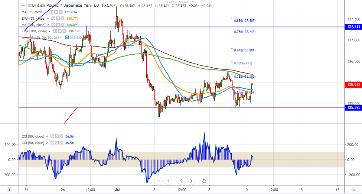 GBPJPY is trading in a narrow range between 135.18 and 136.28 for the past 1-week. Yesterday the pair hits low of 135.38 and shown a minor recovery. GBP was trading lower against USD and lost more than 300 pips in the past 2 weeks on account of Brexit uncertainty. UK GDP m/m came at 0.3% in line with a forecast of 0.3%. and manufacturing production came at 1.4% compared with an estimate of 2.2%. The pair has shown a recovery of nearly 40 pips and hits an intraday high of 135.96. It is currently trading around 135.95.