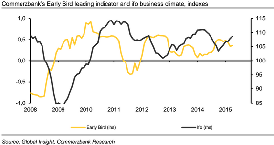 Today's disappointing ZEW outturn confirms the outlook that trees don't grow into the skies for the German economy, as our Early Bird leading indicator has been signalling since the end of 2014. Ifo business expectations for the German economy in the coming six months - a sub-component of the overall index - also declined in April from 103.9 to 103.5 points. Commerzbank expects the headline Ifo business climate index dropped from 108.6 to 108.0 in May.