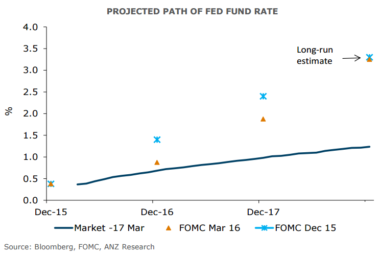 As widely expected, the US Federal Reserve kept interest rates unchanged at its March meeting on Wednesday and downgraded projections for this year. The Fed significantly lowered its estimate for the number of rate hikes in 2016, announcing rates will remain unchanged for at least another month. The FOMC cut the median expectation for the fed funds rate at the end of 2016 by 50bps to 0.9%. The fed funds rate is forecast to rise 100bps in 2017 and the longer run equilibrium rate was cut slightly to 3.3% from 3.5%.