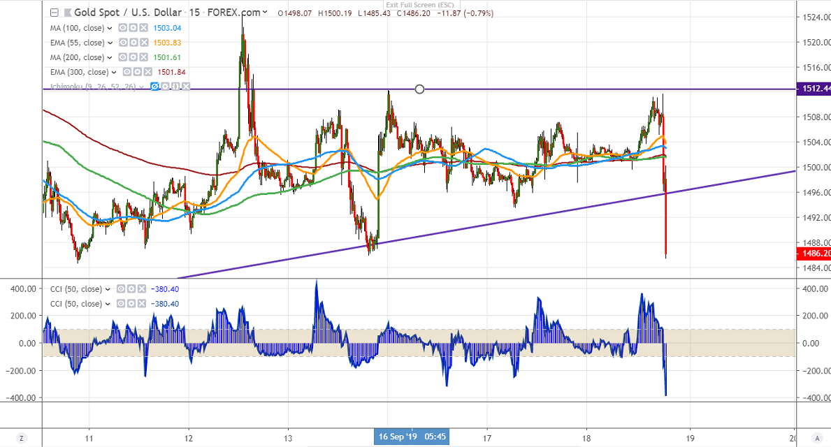 Gold has lost more than $15 after a slightly dovish rate cut by the Fed. The central bank Fed cuts rates by 25 bps to 1.75% -2% as expected with one more rate cut projected this year. The forecasts show that officials split on the need for more easing with vote 7-3. It hits an intraday low of $1485 and is trading around $1486.