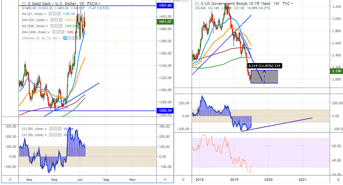 Gold has once again declined after hitting high of $1427. The yellow metal formed a triple top ($1440,$1437 and $1427). US 10 year yield recovered sharply and jumped more than 10% from low of 1.937% and yield is in oversold zone in weekly chart. US CPI came much better than expected with Core CPI m/m at 0.3% compared to forecast of 0.2% highest level since Jan 2018.`The rise in inflation will curb aggressive rate cut by Fed. It hits low of $1400 and is currently trading around $1410.57.