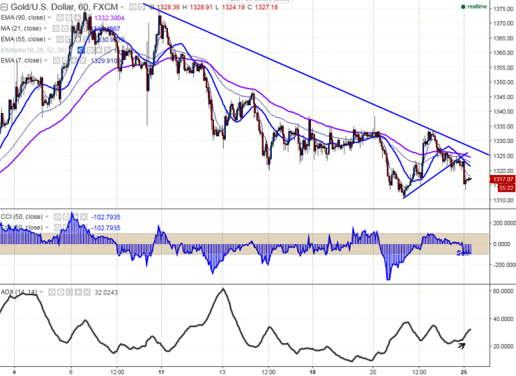 - The yellow metal has broken trend line support $1322 and declined till $1313.47. It is currently trading around $1317.70.