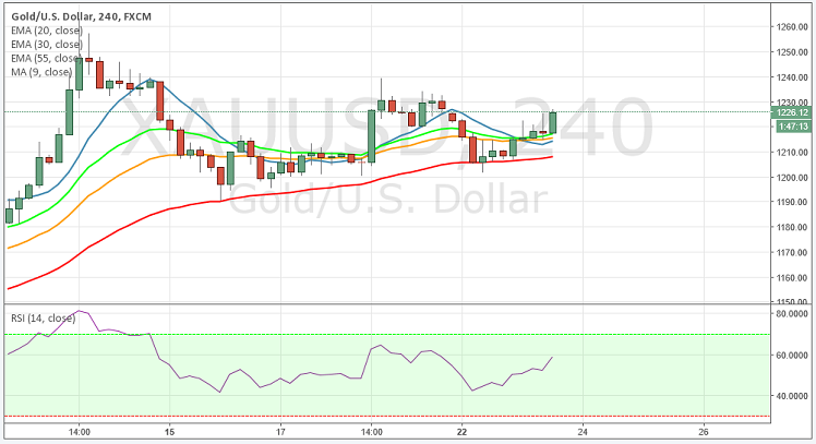 The yellow metal traded higher on Tuesday, as European shares fell and inflows into bullion funds increased boosting metals prices. The commodity rebounded strongly after finding support at 1206 in the early European session, and currently is approaching to test resistance level located at 1234.