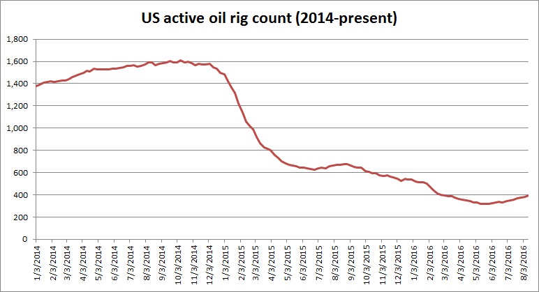 The number of active oil rigs in the United States edged up for an eighth consecutive week to 396. The number of active rigs has climbed more than 25 percent after declining to its lowest point in May this year. Still, the number of operating rigs is down more than 75 percent from their peak in October 2014.
