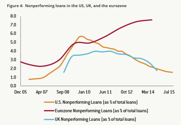After the financial crisis of 2008/09, non-performing loans shot up across developed world. By later 2009, NPLs at U.S. banks crossed both that of Euro Zone and UK and was closer to 6%. NPLs were best contained in UK around 4%. While both of these economies have taken significant steps and reduced their NPLs to almost pre-crisis level, NPLs have crept up around 7% across Euro Zone.