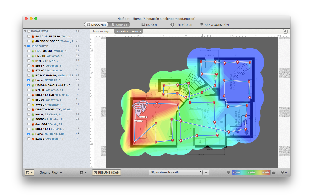 This information is readily displayed right on the default ‘Discover’ view. Toggling the slider switch to move over to the ‘Survey’ mode, and you can build a heatmap of your wireless network.