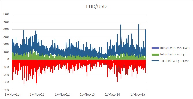 However, directional move wasn't that big. Euro's downside move was much smaller than seen during debt crisis, even upside was much smaller compared to December move.