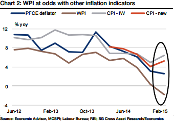 The national CPI has been following a different trajectory altogether and not in sync with the deflationary trend of WPI. Even if one considers the deflator of the private expenditure component of GDP, also known as PFCE (Private Final Consumption Expenditure), the WPI trajectory appears to be at odds.