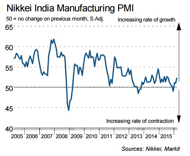 Latest release from Markit economics show that February’s bounce back in manufacturing sector not only continued in March but strengthened to eight month’s high, raising hopes for ‘Make in India’, a vision by India’s Prime Minister Narenda Modi to make India an important infrastructure hub and bring manufacturing’s contribution to GDP close to quarter of a percent by next decade.