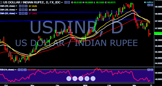 We prefer to take long position in USD/INR around 66.50, stop loss 66.46 and target 67.18 levels.