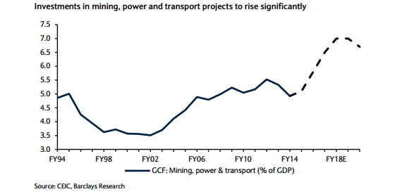 "Even without a big infrastructure spending boost,the economy is expected to expand by a respectable 8.1 % pa on average during the next five years. In 75% potential scenario, increased investment in the foundations of a stronger economy, ie, power availability, logistics and connectivity, and urban infrastructure, would have the biggest impact, as this should also facilitate higher private investment in other sectors of the economy, particularly FDI", says Barclays.