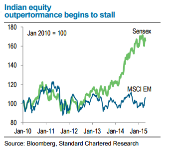 The powerful out-performance of Indian equities relative to those of other emerging markets has finally shown signs of stalling and heavy foreign inflows to the equity market from overseas have begun to abate.