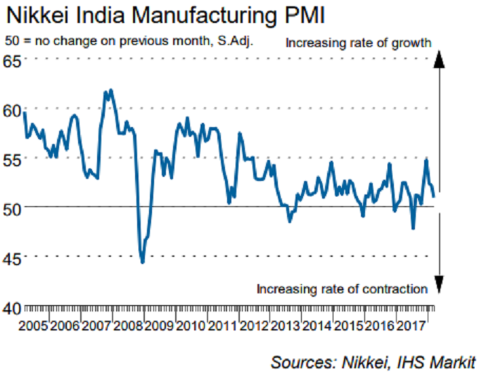 The Nikkei India Manufacturing Purchasing Managers’ Index (PMI) fell from 52.1 in February to a five-month low of 51.0 in March. This indicated the slowest improvement in operating conditions recorded by the survey since last October.