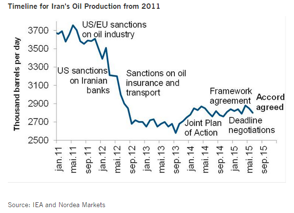 Later in 2013 Iran and the P5+1 managed to strike an interim agreement where Tehran suspended some of its nuclear activities in exchange for some easing of sanctions. This led to a small upswing in Iran's oil production in 2014 and production reached 2.8m b/d in June this year.