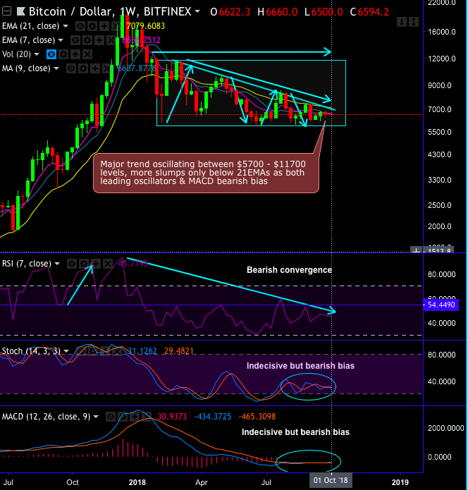 From last couple of days, the low volumes were observed in Bitcoin trades that has been a cause of concern for the cryptocurrency avenue. Although BTC was expected to break out of major resistance levels at $6,800 and $7,000, low volumes prevented it from recording a major movement on the upside (refer above technical chart for price oscillation between the range).