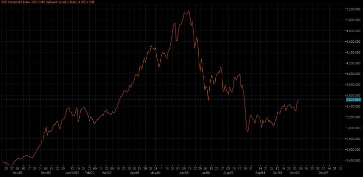 China's stock market is up for second consecutive day and up 20% from low made in August, which technically suggests that benchmark Shanghai composite is in bull market.