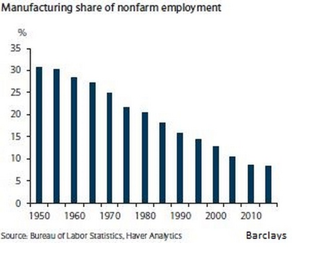 Would it have been 1950, then this weakness would have mattered a lot. Back then manufacturing used to have more than 30% share in non-farm payroll but as of 2015, according to Barclays and as shown in figure it just contributes to 8.6% in NFP and 12.1% in US GDP.