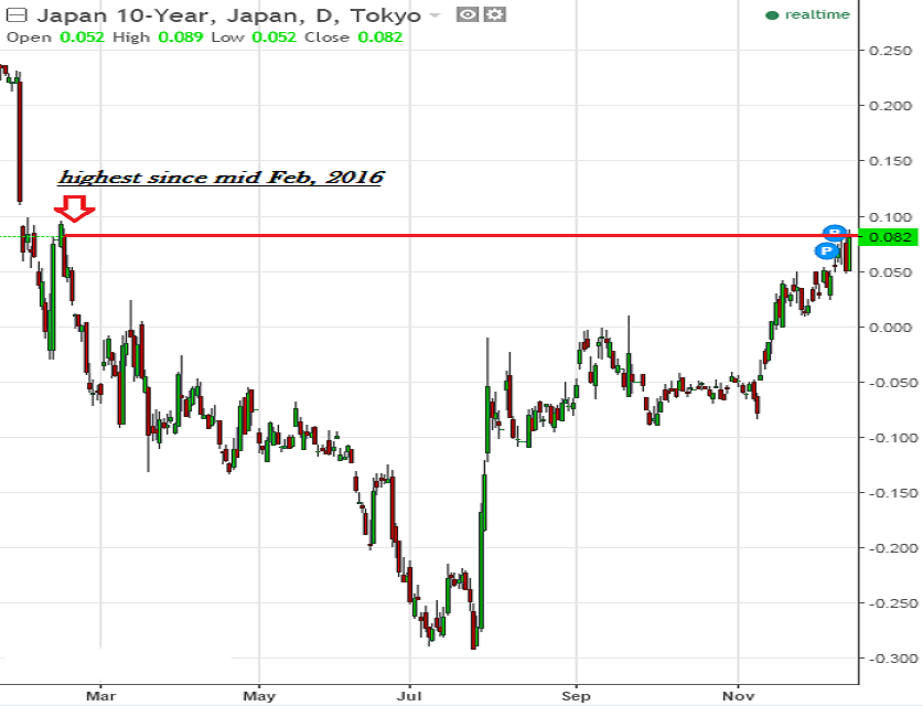 The benchmark 10-year bond yield, which moves inversely to its price, rose 2 basis points to 0.08 percent (highest since mid-February), the long-term 30-year bond yield bounced more than 1 basis points to 0.75 percent and the yield on short-term 2-year note climbed 1/2 basis point to -0.19 percent by 06:30 GMT.