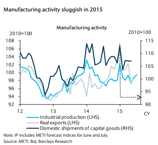 Much of the recent weakness in the economy has been on the manufacturing side. This is evident in the 2015 data on industrial production, real exports and domestic shipments of capital goods ex-transport equipment. METI forecast indices for industrial production in June and July offer some comfort, together with the sharp upward revision to FY15 capex plans in the June Tankan. Yet it remains unclear whether production capacity is insufficient enough (hard and soft data send mixed signals) or production activity is strong enough for the manufacturing sector to fuel capex.