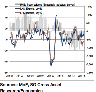 "Japan's trade deficit is likely to come in at ¥200bn in September 2015, which marks an improvement on the ¥962bn of September 2014. On a seasonally-adjusted basis, the trade deficit should reach ¥302bn in September, slightly better than the ¥359bn seen in August", says Societe Generale.