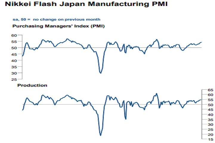 The Flash Markit/Nikkei Japan Manufacturing Purchasing Managers Index (PMI) rose to a seasonally adjusted 54.4 in January from a final 54.0 in December. The index remained above the 50 threshold that separates contraction from expansion for the 17th consecutive month and reached the highest level since February 2014.
