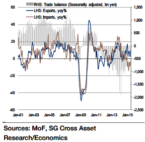 "Looking ahead, previous yen depreciation will not only push up corporate profits but also Japanese exports in volume terms, especially as the US economy is likely to recover. Against this backdrop, the trade balance is likely to continue to improve, though it will still take some time before a trade surplus can be reached on a sustainable basis", added Societe Generale.