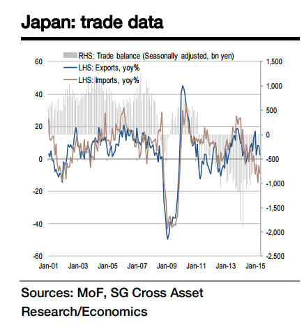 June's trade balance is likely to have reached balance (¥0). This will be an improvement from the ¥834bn deficit seen in June 2014. On a seasonally-adjusted basis, the trade deficit is likely to have expanded to a ¥260tn deficit (was -¥180 bn in May 2014).