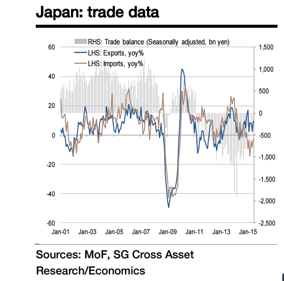 Japan's July trade balance is likely to have reached a balance (¥0). This would mark a significant improvement from the ¥967bn deficit seen in July 2014. As oil prices have fallen rapidly, the terms of trade are improving, leading to a shrinking trade deficit as a trend. Exports in July are expected to grow by 3.5% yoy (was +9.5% yoy in June) while imports likely shrunk by 10.5% yoy during the same month (after -2.9% yoy in June). As exports were weak last year, export growth this year will be pronounced due to the base effect.