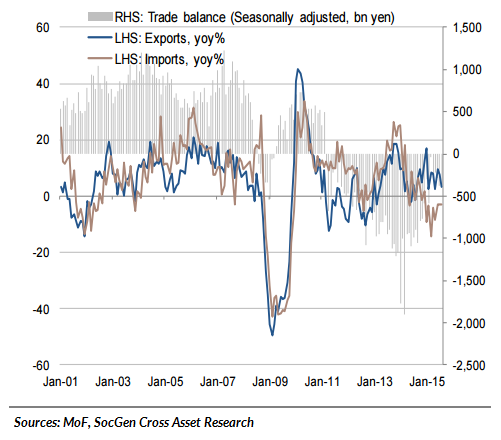 "The Japan's trade deficit is likely to come in at ¥200bn in September 2015, which marks an improvement on the ¥962bn of September 2014. On a seasonally-adjusted basis, the trade deficit should reach ¥302bn in September, slightly better than the ¥359bn seen in August", notes Societe Generale in a research note.