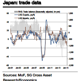 "On a seasonally-adjusted basis, the trade deficit is likely to have expanded to a ¥260tn deficit (was -¥180 bn in May 2014). Exports in June are expected to grow by 9.0% yoy (was +2.4% yoy in May) while imports likely shrunk by 4.4% yoy during the same month (after -8.7% yoy in May)", says Societe Generale.