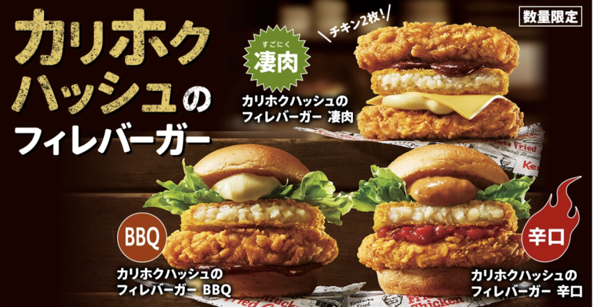 KFC Japan is adding the Karihoku Hash Filet Burger range, a combination of fried chicken and hash browns, made in three variants, to its menu.